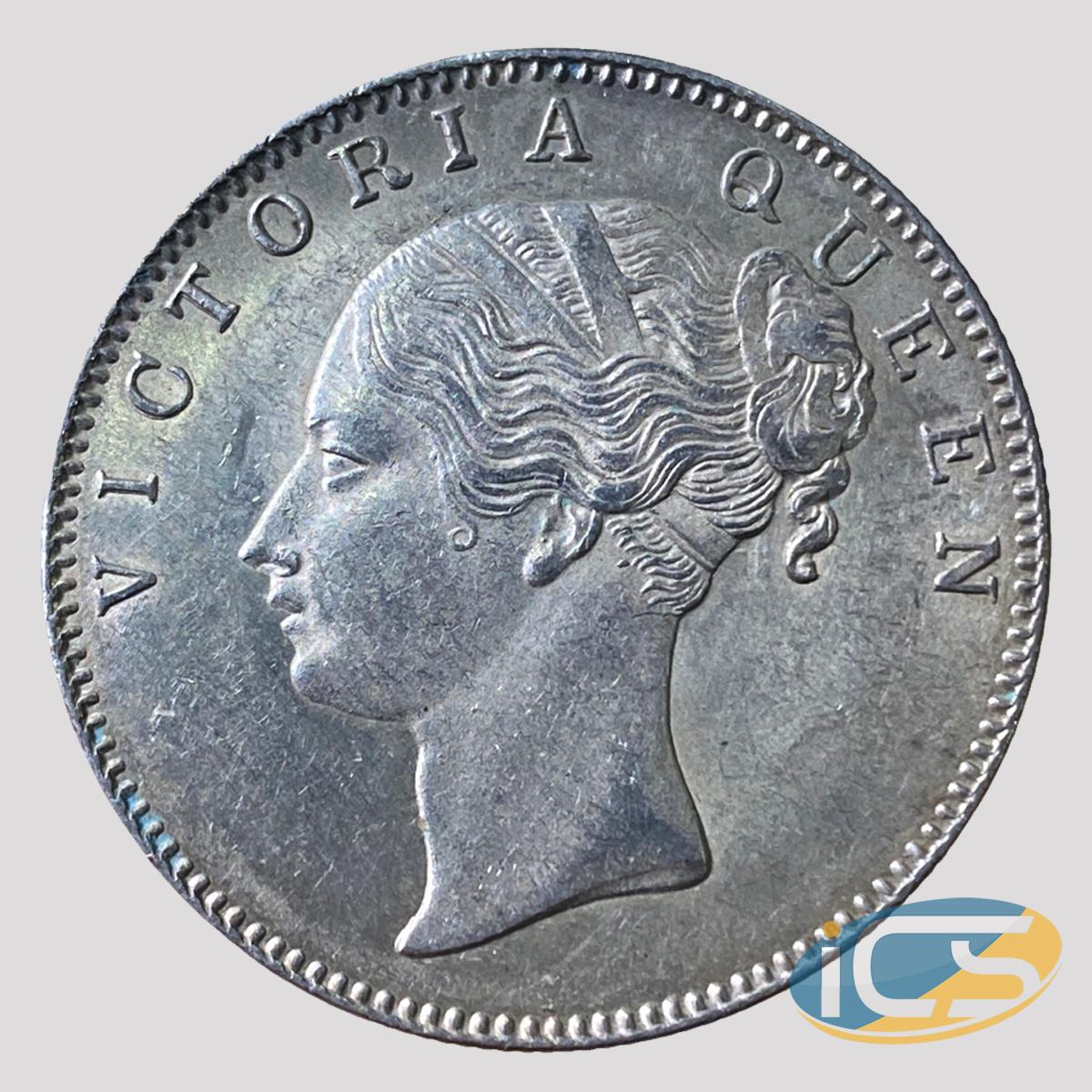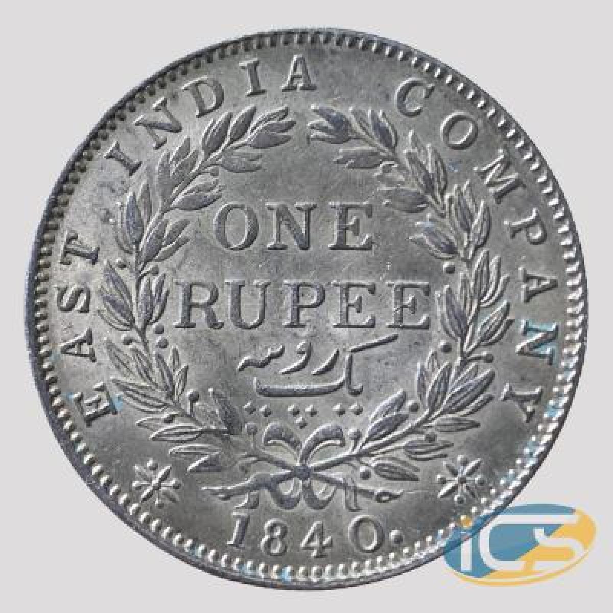 EIC, Victoria Queen, Silver Rupee, 1840 AD, continuous legend ( CL ), Calcutta Mint, A/II, English Head, With bud leaves above ‘O’ and ‘E’ of One, Wreath with 19 Berries (10L + 9R), Crescent on Left ribbon bow, 11.66 gms, 31.32 mm.
