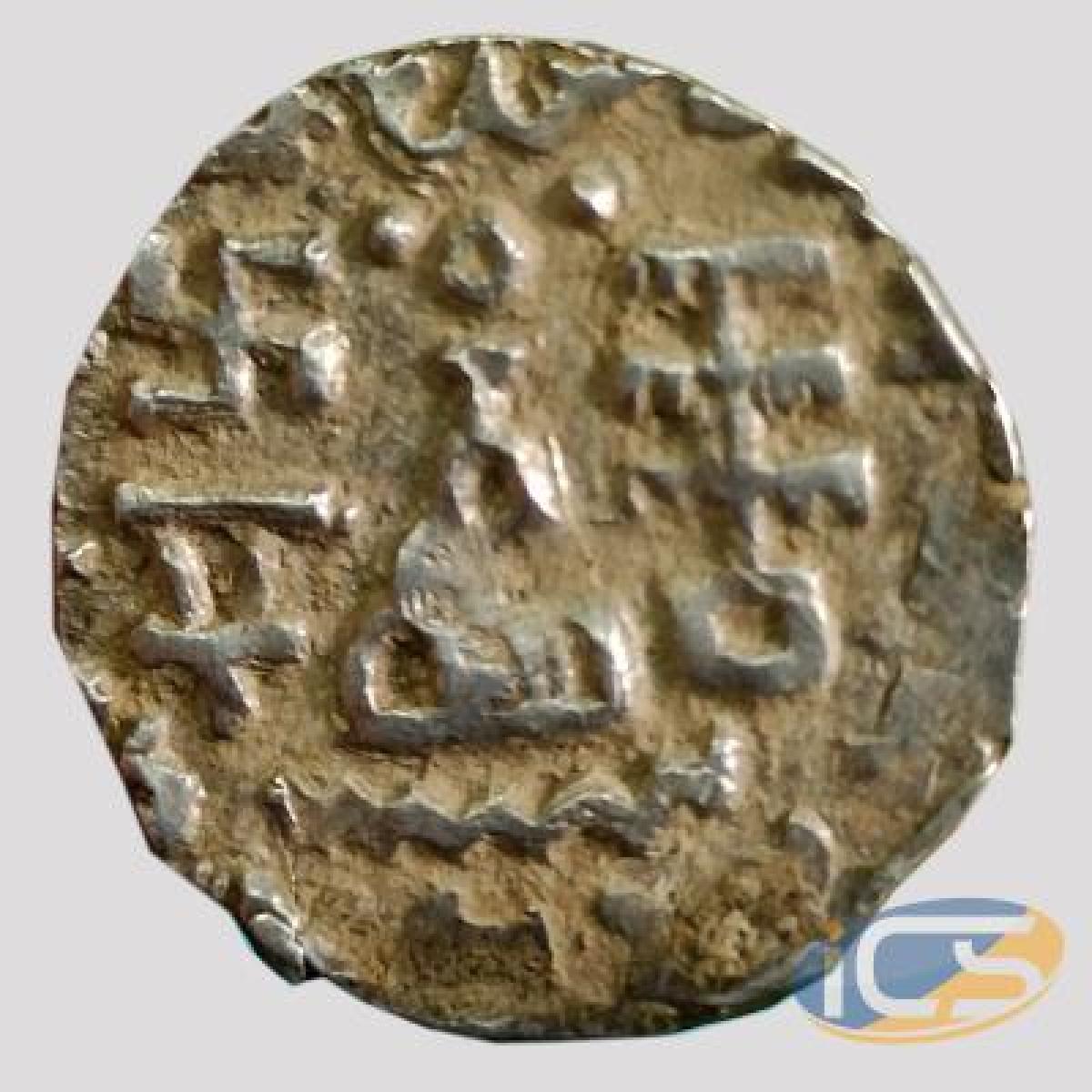 Obv: a deer standing to the right with a square-shaped vase above its back, an early Srivatsa symbol between its horns, the goddess Lakshmi stands on a Nandipada on the right field in front of the deer, facing forward, and holds a lotus flower with an upraised right hand, Brahmi legend "Rajnah Kunimdasya Amoghbhutisya Maharajasya" (Great king Amoghbhuti, of The Kunindas) around the field,