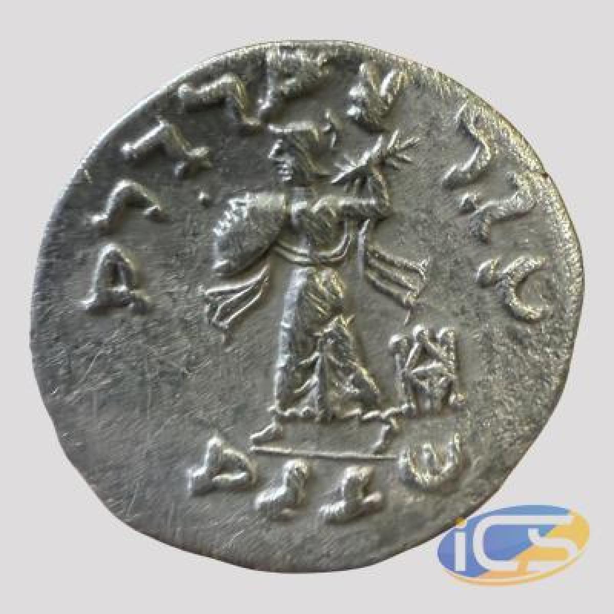 Rev: Athena alkidemos standing to right, holding thunderbolt with Kharoshti legend, 'Maharajasa tratarasa menamdrasa'.